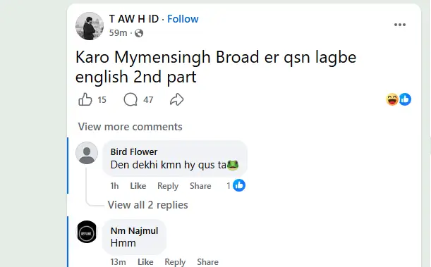 At around 9:03 pm on Monday, a user identified as “T AW H ID” made a new post in the group. The post claimed to have the Mymensingh Board English 2nd Paper question. By the time of reporting, it had received dozens of comments and reactions.